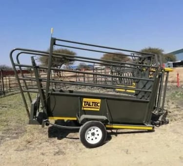 The mobile work and load trailer is equipped with a neck clamp at the front and a guillotine gate at the back. It can also be used as a loading ramp when needed and can function as a scale with the LS4 Scale (1000mm loadbars) mounted at the bottom. The trailer has the capacity to transport up to six 2.3m kraal sides. It is roadworthy, and a spare wheel can be purchased separately. Essentially, it is an all-in-one trailer.
