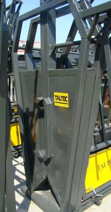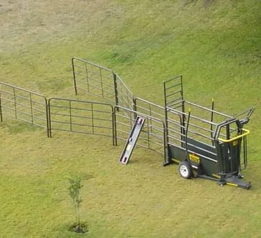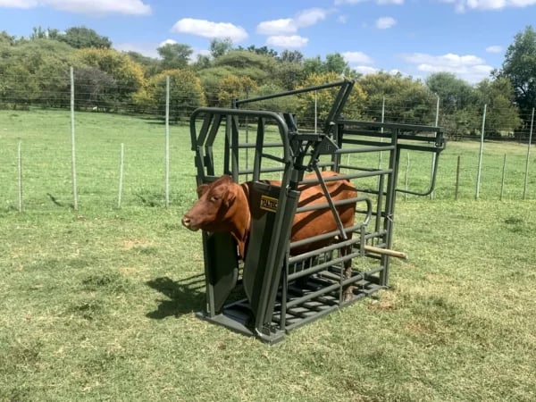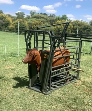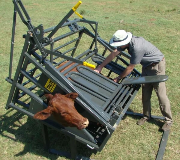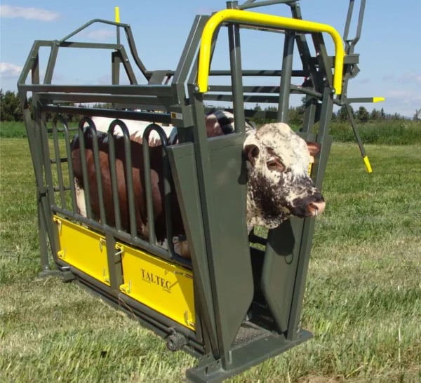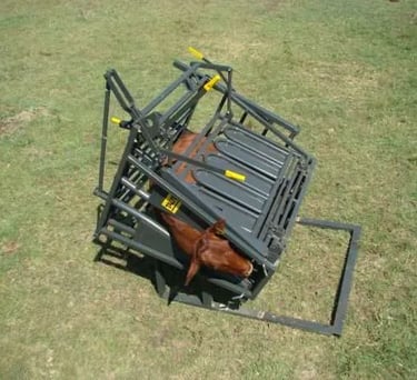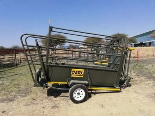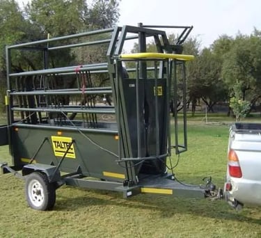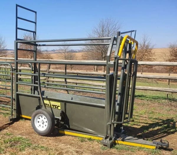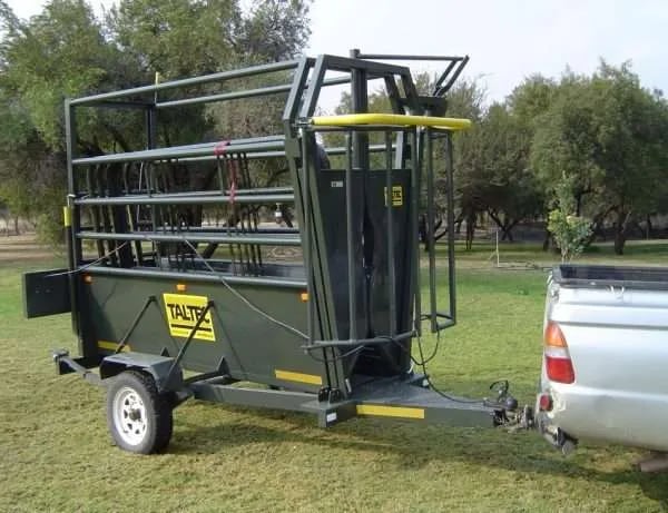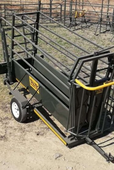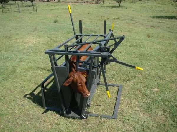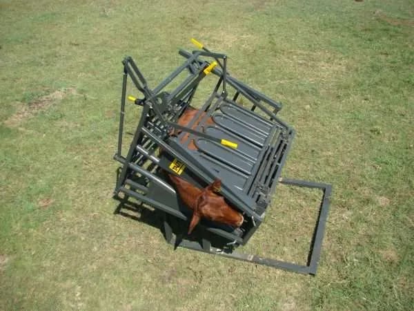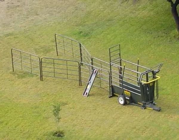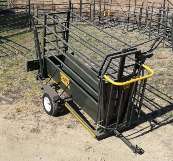 The cattle mobile crush on wheels features a neck clamp, guillotine gate, and optional LS4 scale to weigh.
