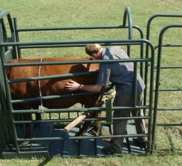 This working crate includes a front neck clamp, rear sliding gate, and side panels for guiding cattle.